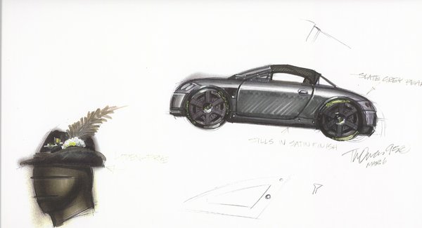 Ami pedig a Roadster formáját illeti, az 1995-ös tervezési szakaszban valahogy így nézett ki a vázlat, mely alapján elkészülhetett a TT nyitott verziója is, első körben TTS márkajelzéssel: