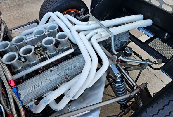 A CAV GT40-eseinek utascellája egyedi, alumíniumból készült, a belseje a régiét idézi, és stílszerűen Ford V8-as hajtja. Ezt a konkrét példányt eredetileg a Gulf híres világoskék-narancs színkombinációjában készítették, később lett egyszínű. Szerencsére nem nullázták le az eredeti dekort: az Indigo Blue szín csak fólia, alatta még mindig ott a Gulf dizájn.