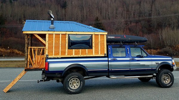 Ebben az esetben előny, hogy a Ford F-350 minden irányban óriási, így még a platóra szerelt egység is lehet tágas és komfortos. A hosszú platós F-350-re épített faház váratlanul tágasnak tűnik, és még egy kisebb méretű terasz is elfért, igaz, az már neccesen, mivel jóval túllóg az autón. Az 1996-os pickup önmagában baromi jól néz ki, a faházzal együtt viszont furcsán eklektikus, de azért nagyon hangulatos az összkép.