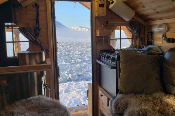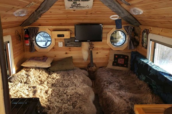 Az alkotó igyekezett mindent bevetni, hogy a kunyhó úgy nézzen ki, mint egy erdei faház, annak minden fontos elemével. A belsőt mindenhol fa lambéria borítja, amit ügyesen feldobnak a kezeletlen fa elemek és az egyedi fazonú ablakok. Vannak kanapék – amik egyben ágyak is –, tűzhely, vécé, tárolórészek és tévé is. A tető csúcsánál 187 centis a belmagasság, ami pont elég ahhoz, hogy bent fel lehessen egyenesedni.