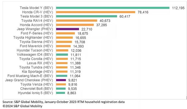 A villanyautók piacán egyetlen gyártó sem tudott labdába rúgni az összesített listát vezető Tesla Model Y, és a harmadik helyen álló Model 3 mellett. Az elektromosok között a harmadik a Volkswagen ID4, ám utóbbi utcahosszal le van maradva a Tesláktól, a listán pedig csak a tizenegyedik.