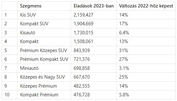 2023-ban az eladott autók több mint fele, 51 százaléka valamelyik SUV kategóriából került ki. A szegmensek szerinti népszerűségi lista elején ráadásul két SUV kategória, a kis SUV-k és a kompakt SUV-k végeztek, 2,1 millió és 1,9 millió eladott példánnyal. Ez 14 és 17 százalékos növekedést jelent 2022-höz képest.
