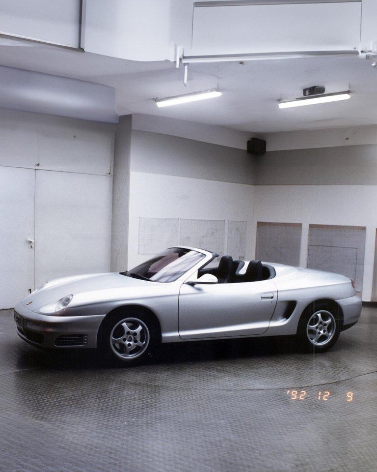 És a Boxster, amit itt még egyáltalán nem a Boxster, hanem csak a 986-ot gyári kód? Itt is van mit nézni, hiszen az 1992-es dátumhoz képest a sorozatgyártott roadster csak 1996-ban jött ki, a 911-es ajtajaival és fényszóróival azért, hogy olcsóbb legyen gyártani.