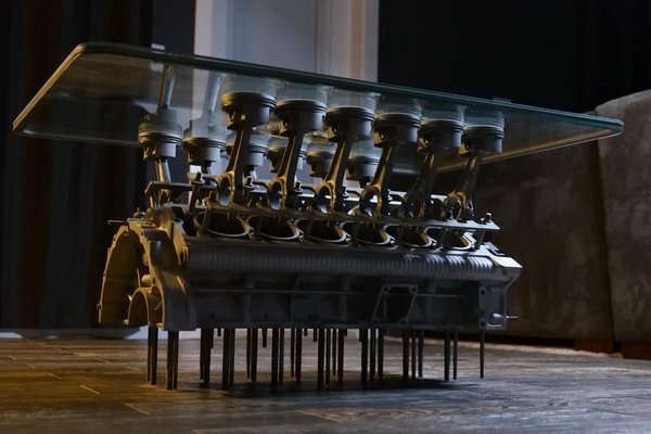 Már elsőre is látszik, hogy az alkotó nem magát a motort szerette volna kiállítani, hiszen rengeteg eleme hiányzik. A V12-es legjellegzetesebb alkatrészeit jól fel lehet ismerni, de az asztal kellően szellős ahhoz, hogy ne legyen zsúfolt, és ne is keltsen elnagyolt benyomást.