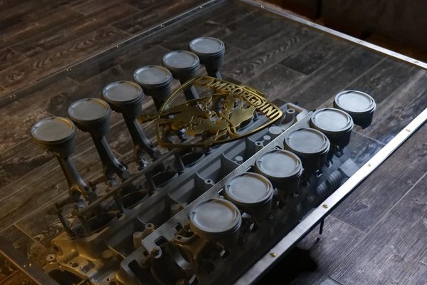 A Lamborghini Diablóból származó motorból kikerült a tizenkét dugattyú és hajtókar, ezeket a blokkra kívülről erősítették fel. A dugattyúk tetejére került az üveglap, amin keresztül gyönyörűen látszanak az alkatrészek. Menő részlet az üveg fém szegélye, viszont a hatalmas, aranyszínű Lamborghini embléma már kevésbé ízléses.