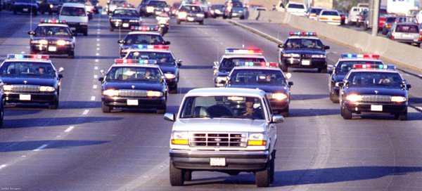 Különösen alakultak az események, amikor 3 nappal később O.J. Simpsont látták fehér Ford Broncójában és értesítették a rendőrséget. Ő maga hátul ült és egy pisztolyt szegezett a fejéhez, míg az autót barátja és egykori csapattársa, AI Cowlings vezette. Amikor a rendőrök felzárkóztak, Cowlings kiszólt nekik, hogy Simpson öngyilkosságot tervez, ezért a továbbiakban csak lassan követték.
