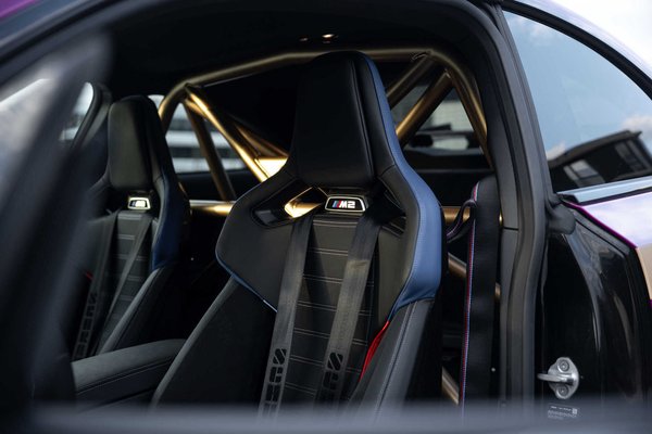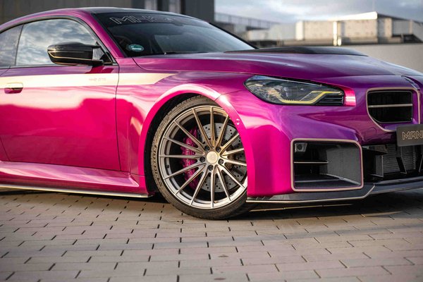 Már a sima M2-vel is nehéz nem feltűnősködni, de ha erre dobsz még pár karbon elemet, majd az egészet lefújod magentára pezsgő színű kiegészítőkkel, akkor nincs menekvés. 20 és 21 colos felnijei is pezsgő színűek, ami hátul nem csak nagyobb, hanem szélesebb is.