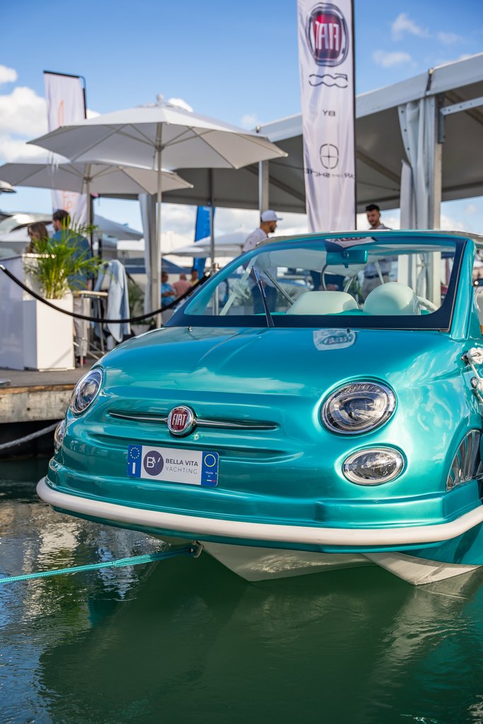 Külsőre tényleg egy Fiat 500 a vízen, ezt kár részletezni, ez a mentalitás azonban a fedélzeten is megtalálható: a kormány, a központi kijelző kerete és a műszeregység is a szárazföldi Fiat 500-asokéra hasonlít. Poén, hogy van benne/rajta visszapillantó tükör, és a fényszórói is működnek.