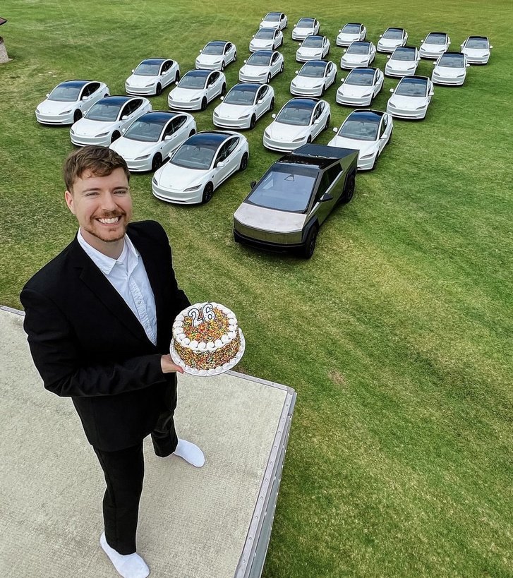 Jimmy most ünnepelte születésnapját, 26 éves lett, ezt pedig azzal szeretné megünnepelni, hogy elajándékoz 26 darab Teslát. Ezt a Instagram-oldalán jelentette be egy olyan poszt kíséretében, ahol egy tortával és a 26 autóval pózol. Ezúttal ez egy sima nyereményjáték, semmilyen komoly feladatot nem kell teljesíteni. A feltételek egyszerűek: elég bökni egy like-ot a posztra, bekövetni MrBeast profilját, illetve meg kell jelölni két ismerőst kommentben az eredeti poszt alatt.