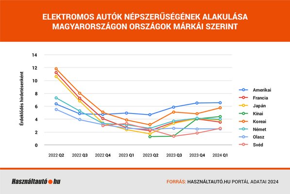 Míg 2022-ben kapósak voltak dél-koreai, francia és japán elektromos autók, népszerűségük nagyjából a felére csökkent 2023 második negyedévére. Ezzel együtt ekkor jelentek meg az első komolyabb kínai elektromos autók, melyek 2024 első negyedévére nagyjából megtriplázták népszerűségüket, ez a grafikonon is jól látszik. Egészen jó helyezést értek el a német és olasz gyártók is, de enyhe csökkenéssel kellett szembenézniük az érdeklődést tekintve, míg az amerikai elektromos autókat jelentős százalékban fedő Tesla lassú, de biztos emelkedést mutat. Ez nem meglepő, hiszen az utóbbi időben a gyártásoptimalizálásnak köszönhetően jelentős mértékben tudták csökkenteni modelljeik árát, így sok vásárlót nyertek, a lépés pedig a használt példányok helyzetére is hatással volt.