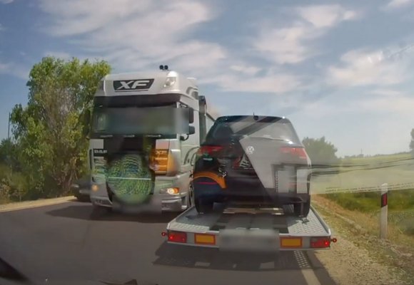 Pontosan egy ilyen esetről készült felvétel most is: az egyébként hírhedt 4-es főúton, Püspükladány és Karcag között előzött egy nagypótot húzó nyerges vontató, méghozzá lendületből. A kamion a szűk úton előzött egy – vagy több – személyautót, és azzal nem törődött, hogy jönnek szemből, a manőver nem kivitelezhető biztonságosan.