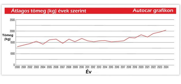 Az autók súlyának növekedése nem volt mindig ilyen egyértelmű. Az Autocar a 2000 és 2017 közötti években 1500 és 1650 kg közötti változást mért, az 1700 kg-os határt csak 2018-ban lépték át a tesztelt autók. A trend idén sem látszik megfordulni. 2024 első negyedévében az Autocar által tesztelt autók átlagos tömege 2087 kg volt, igaz, ezek többségében vagy SUV-k vagy elektromos autók voltak.