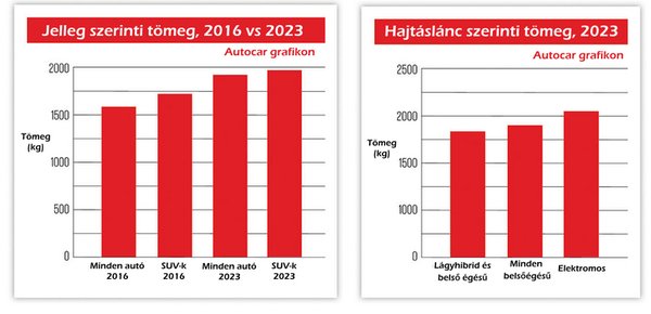 A brit Autocar magazin adatainak összesítése szerint 2016 és 2023 között 1553 kg-ról 1947 kg-ra nőtt a tesztelt új autók átlagos tömege. A növekedést természetesen főként az SUV szegmensbe tartozó autók számának növekedése okozza.