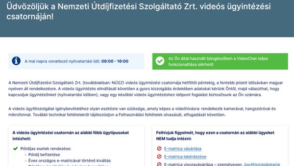 A videós ügyintézés a nemzetiutdij.hu oldalon, a „Videóhívás” gombra kattintva érhető el, hétköznap 8 és 16 óra között. A szolgáltatás igénybevételéhez egy videóhívásra alkalmas, mikrofonnal, kamerával és hangszóróval felszerelt eszköz szükséges. Bár egy okostelefon is ilyen, a vállalat elsősorban asztali számítógépet vagy laptopot ajánl, mivel az ügyintézés során be kell mutatni a személyes- és járműadatok megerősítéséhez szükséges dokumentumokat.