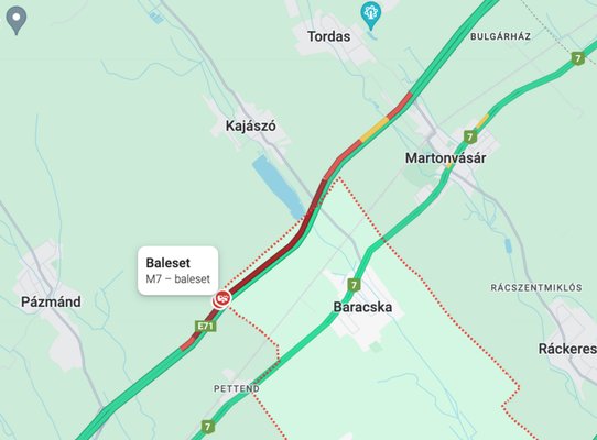 Az Útinform közleménye szerint baleset történt az M7-es autópálya Letenye felé vezető oldalán. Baracska térségében, a 39-es kilométernél több jármű hajtott egymásba. Jelenleg csak a külső sáv járható, a torlódás 5 kilométeres. Ha a Balatonra indulnál, mindenképp tájékozódj előtte, mert hatalmas dugóba futhatsz bele.