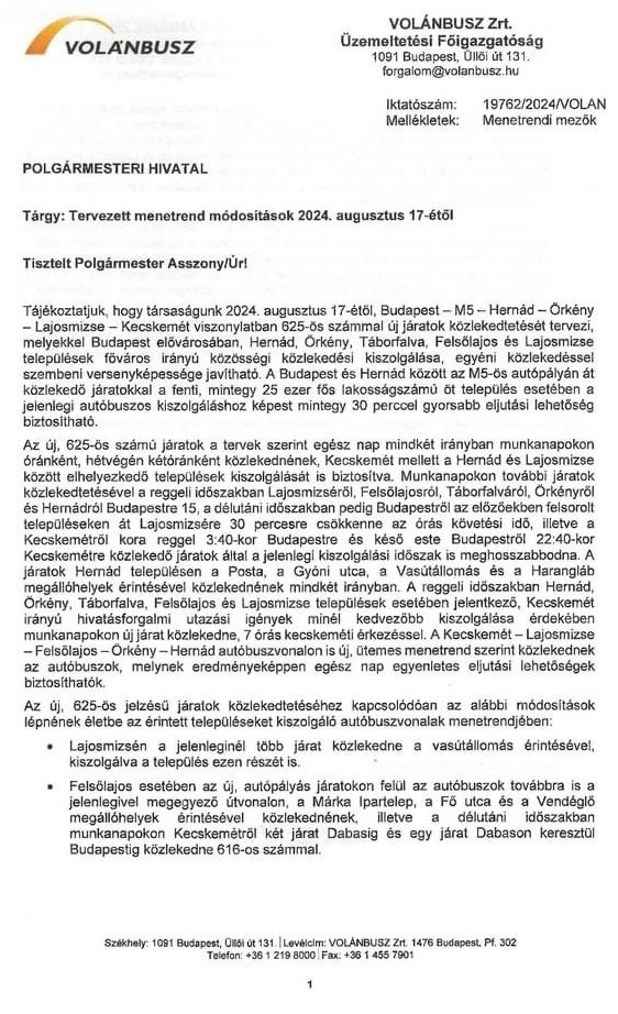 Az Építési és Közlekedési Minisztérium egy új buszviszonylat indítását mérlegeli a 142-es azaz Budapest-Lajosmizse-Kecskemét vasútvonal Lajosmizse és Dabas közti szakaszának kiváltására. Az új járat a 625-ös számot viseli és expresszjáratként közlekedne Kecskemét és Budapest között úgy, hogy Kecskemét és Hernád között a buszok a településeken keresztül, míg utána az M5-ös autópályán haladva járnának, a jelenlegi járatokhoz képest fél órával rövidebb menetidővel.