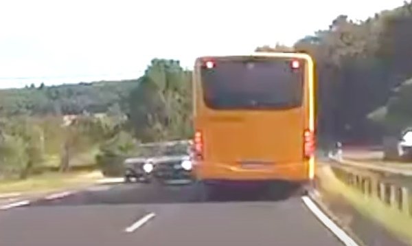 A 82-es főúton, Eplény közelében vett fel egy hajmeresztő előzést a BpiAutósok egyik olvasójának menetrögzítő kamerája a közelmúltban. A videón először az látszik, ahogy a távolsági busz vészfékez, de ekkor még nem derült ki, hogy miért.