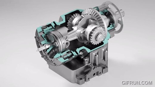 - A motornak bár csak egy hengere van, hajtókarból és főtengelyből kettő. Alul egy fogaskoszorún köröz két kisebb fogaskerék, ebben vannak a főtengelyek.