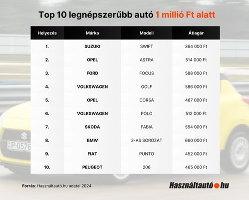 364 ezer forintos átlagárral a Suzuki Swift a legolcsóbb és a legnépszerűbb modell, amire több mint háromszor annyi érdeklődés érkezik, mint a 10. helyen álló Peugeot 206-ra. A Swift 22,3 éves átlagéletkorát csak a Volkswagen Golfok 22,9 éves átlagéletkora múlja felül, míg 18,8 átlagévével a Ford Focus számít a legfiatalabbnak. 660 ezer forintos, vagyis a listán szereplő legmagasabb átlagárral pedig a jellemzően 22,1 éves 3-as BMW-t is meg lehet csípni. Jelenleg a legolcsóbb darab 190 ezer forintba kerül.