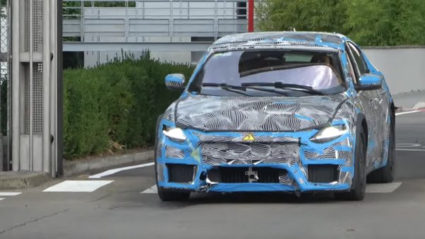 Nagyon furcsa szerzet tűnt elő ugyanis a sorompók mögül. A crossovernek tűnő járművet teljes egészében álcafestés borítja, így nehéz kivenni a formát. Bár hang alapján azt hihetnénk, hogy az autó motorterében egy nagy köbcentis V8-as lapul, ez bizony egy elektromos autó. Erről árulkodnak az áramütésre figyelmeztető sárga matricák, illetve az elnagyolt kamu kipufogóvégek, amikre érdekes módon pont nem jutott álcázás.