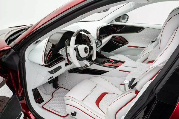 Az extrém külsőhöz képest a belső szinte visszafogott: a Mansory a Purosangue teljes utasterét elefántcsont színű bőrrel vonta be, amit itt-ott perforációk, vörös betétek és rengeteg Mansory logó egészít ki. Érdekes, hogy bár az autó Ferrari mivoltára semmi sem utal, a középkonzolon megjelennek az olasz nemzeti színek.