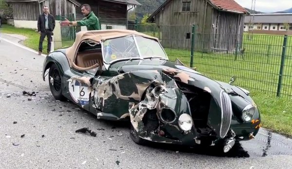 Egy ilyen régi, a töréstesztet még hírből sem ismerő autónál az is hatalmas szerencse, hogy a benne ülők nem sérültek meg komolyabban. A Jaguarban két olasz férfi utazott, akik épp tesztkörre vitték el az XK120-at, ami a 2025-ös Mille Migliára készítettek fel. Esélyes, hogy ez a terv elúszott.