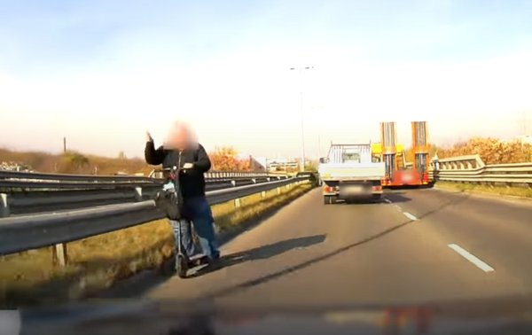 Egy közlekedő menetrögzítő kamerája vette fel, ahol a Határ út felett átívelő felüljárón szemből érkezik két rolleres a belső sávban. Az első rollerest ledudálták, de még ebből se jött rá, hogy valamit rosszul csinált: neki állt feljebb, felháborodva mutogatott.