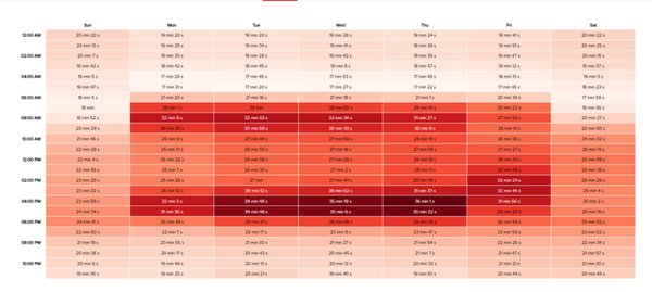 Ez a táblázat egy hőtérkép, hogy mikor mennyire sűrű a forgalom. Eszerint a kedden, szerdán és csütörtökön a legrossazbb a helyzet délután 4 és 5 óra között.