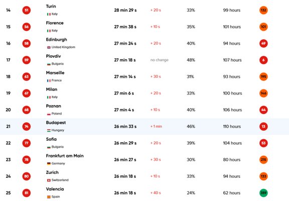 - Budapest globálisan a 74., Európában pedig a 21. legrosszabb hely a közlekedés szempontjából; a legsúlyosabb helyzet Európában Londonban tapasztalható.