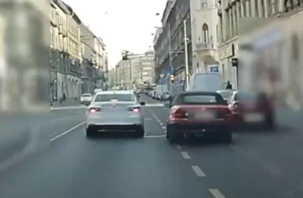 A kamerás autó sofőrje aggódik: szerinte benne van a pakliban, hogy komoly balesetet fog okozni, ha nem fékezik meg. Nem ez az első olyan eset, amikor a fehér Matiz vezetője nem tudott viselkedni: korábban a piros lámpa ellenére lazán kikanyarodott a Jászberényi útra, aztán leszorított egy autóst, aki emiatt a szembesávba kényszerült.