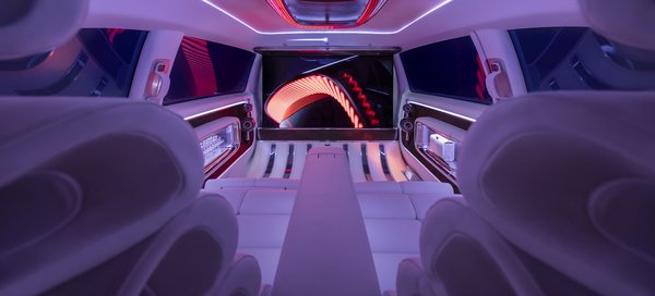 Rengeteg a látványos, fényes, csillogó üvegfelület van az autóban, ami mögött különböző funkcionális- vagy dísztárgyakat – jellemzően hangszórókat – helyeztek el. A műszerfal egy nagy táblából áll, amit három kisebb, érintőkijelzős szekcióra osztottak szét, mégsem ez a legnagyobb megjelenítő felület az autóban. A hátsó utasok beszállása után kiemelkedik az első ülések mögül egy 65 colos (165,1 cm) képátlójú, 4K képfelbontású kijelző, illetve hét különálló projektorral a beltér további felületeire is képesek vetíteni, ezzel fokozva a hangulatot. Hogy teljes legyen a moziélmény, a Vison V-ben egyszerre 42 hangszóró szórakoztatja a hátsó utasokat.