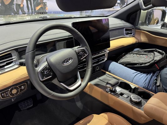 A beltér fő eleme egy nagy központi táblagép, ugyanakkor jó hír, hogy hagytak néhány látványos fizikai kezelőszervet is. A középkonzolon például van egy tekerőtárcsa, ami nagyon emlékeztet a Ford megoldására, a kormány pedig olyan, mintha a Volkswagentől vették volna át.