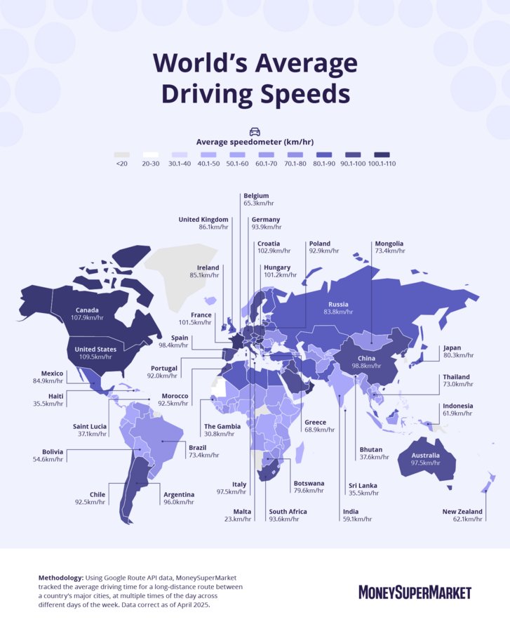 Érdekes tanulmányt tett közzé nemrég a MoneySuperMarket. A gépjármű biztosítási szakértő arra volt kíváncsi, a világ különböző országaiban hogy alakul az autósok átlagsebessége. Fogtak hát egy rakás adatot a Google Routes API-ból, majd nekiálltak számolgatni.