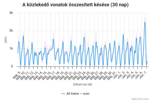 A helyzet még csúnyább, hogyha az elmúlt 30 nap késő vonatainak arányát nézzük, péntek 17:00-kor a vonatok 45,53 százaléka késett legalább 5 percet, amely 7 százalékponttal rosszabb, mint bármely másik nap azonos adata az elmúlt 30 nap alatt.