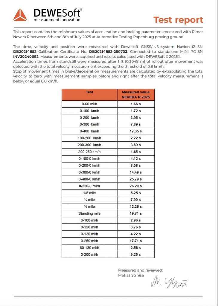 Az autó összesen 24 sebességi világrekordot döntött meg, ebből 23-at a korábbi Nevera tartott. A teljesség igénye nélkül itt van pár új világrekord:
