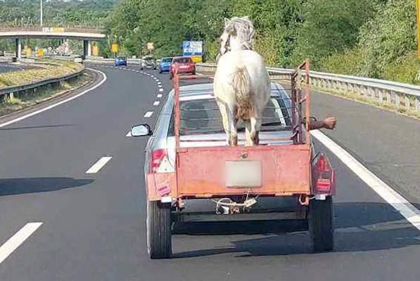 Megdöbbentő jelenetet rögzített az MKIF egyik forgalomfigyelő kamerája az M7-es autópályán. Egy felelőtlen sofőr egy sima, lószállításra maximálisan alkalmatlan utánfutóval szállított egy fehér lovat. Ahogy azt sejteni lehetett, az állatot semmilyen módon nem rögzítette.