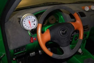 Sok építés megáll a külső-belső módosításoknál, de szerencsére ennél a Mazdánál nem így történt. A gyári kétliteres, négyhengeres motorból indultak ki, ami kapott egy masszív turbó szettet, egyedi hűtőt és intercoolert is. Azt sajnos nem lehet tudni, hogy az eredeti építés után az autó hány lóerő lehetett – főleg nitróval megküldve – de a hajtásláncon nem módosítottak, még mindig csak az első tengelyt hajtja. Valószínűleg még így is pokoli gyors, bár aki megveszi, annak most nem a menetdinamika lesz az első.
