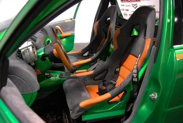 Hasonlóan a külsőhöz, a beltérben is a 2000-es évek tuningkultúráját idéző módosítások vannak. Finom szürke és narancssárga színű kárpitokkal húztak be mindent, beépítettek néhány látványos extra műszert és egy masszív Clarion hifi rendszert is. Több helyen is festett karbon panelekre cserélték a beltéri idomokat, illetve Cobra Imola versenyüléseket építettek be ötpontos biztonsági övekkel.