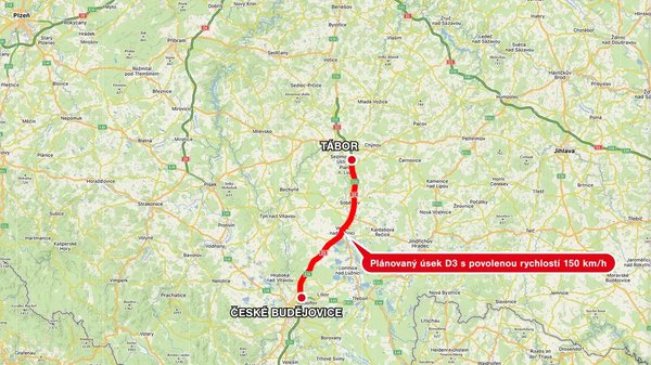 Pénteken megkezdődött a 150 km/h-s sebességhatár előkészítése, a dél-csehországi D3-as autópályán – a České Budějovice és Tábor közötti, mintegy 50 kilométeres szakaszon már zajlik a speciális, változtatható sebességkorlátozást kijelző táblák telepítése. Ez lesz az első olyan autópálya Csehországban, ahol a sofőrök a jelenlegi 130 km/h helyett 150 km/h sebességgel közlekedhetnek, igaz, szigorúan szabályozott feltételek mellett.