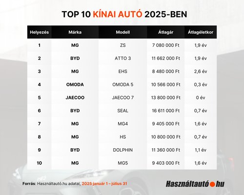 A Használtautó.hu közleménye alapján az érdeklődések száma látványosan nőtt, miközben új szereplők is megjelentek a toplistán. A MG ZS modell iránti kereslet bő háromszorosára nőtt, a BYD pedig immár három különböző modellel képviselteti magát a legnépszerűbb kínai típusok között.
