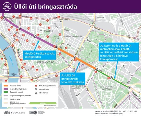 Hozzátetták: a beruházás célja, hogy az Üllői út és a Váci út egy-egy további szakaszán magas minőségű, irányhelyes, irányonként épített elemmel védett kerékpársávok és kerékpárutak létrehozásával újabb városrészek váljanak biztonságosan elérhetővé kerékpárral.