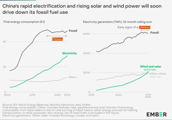Szemléletes példa a fejlődésre, hogy az év első felében 212 GW új napelemes kapacitást kapcsoltak be, ami több, mint az Egyesült Államok teljes 2024-es, napelemekben mért kapacitása (~178 GW). Ennek eredményeként az ország szén-dioxid-kibocsátása 2025 első felében 1 százalékkal csökkent, miközben az áramigény tovább nőtt, és a napenergia már megelőzte a vízerőműveket; idén várhatóan a szélenergiát is túlszárnyalja, mint legfőbb tiszta energiaforrás.