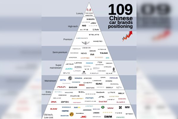 A képen azt is színnel jelölik, hogy melyik külföldi, de már kínai tulajdonban lévő márka, illetve melyik vegyesvállalat. Összesen 109 gyártó látszik a képen. Munoz egy piramisábrát is posztolt, ami a márkákat pozíció szerint rendezi. A sok gyártóhoz egyébként hatalmas piaci részesedés is tartozik: