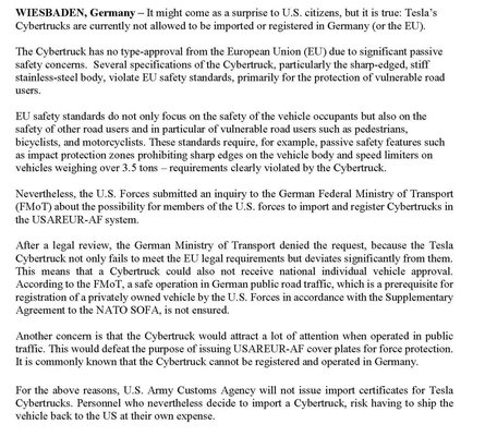 Az Egyesült Államok katonasága megkérdezte az illetékes német hatóságot, hogy lenne-e bármilyen lehetőség Cybertruckot importálni, a válasz pedig egy egyértelmű nem volt. A típus ugyanis olyannyira szembemegy az EU biztonsági előírásaival, hogy az már túlmutat a két fél közötti megállapodáson. A másik indoklás pedig az, hogy a Cybertruck túlságosan hivalkodó, miközben az itt tartózkodó katonáknak egy megállapodás szerint éppen, hogy kerülniük kell a feltűnést. Ez egy Cybertruckkal elég nehéz.