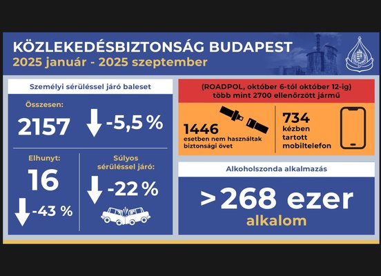 2025 első kilenc hónapjában 2157 személyi sérüléssel járó közúti baleset történt Budapesten, ami 5,5 százalékkal kevesebb, mint 2024 azonos időszakában. A súlyos sérüléssel járó- és a halálos baleseteknél még nagyobb a javulás. 2025-ben eddig 16-an vesztették életüket a főváros útjain, ami 43 százalékkal kevesebb az egy évvel korábbi adatnál, míg a súlyos sérültek száma 22 százalékkal csökkent. A balesetek leggyakoribb okai a gyorshajtás, a figyelmetlenség, valamint az elsőbbség és az előzés szabályainak megszegése.