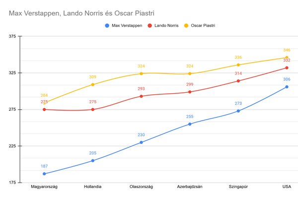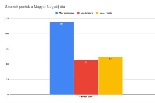 Az adatok azonban még kijózanítóbbak, ha összesítjük, hány pontot szerzett a világbajnokság három esélyese az elmúlt hat versenyen. Verstappen ebben az összevetésben toronymagasan vezet: 119 pontot kapart össze a Magyar Nagydíj óta, ami közel kétszer annyi, mint Oscar Piastri 62, valamint Lando Norris 57 pontja:
