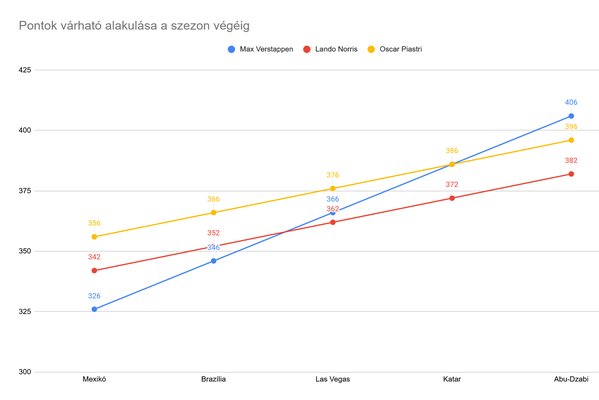 Ebben az esetben Verstappen Las Vegasban megelőzné Norrist, Katarban beérné Piastrit, a szezonzáró Abu-Dzabi Nagydíj után pedig őt koronáznák világbajnoknak, 10 ponttal az ausztrál, és 24 ponttal a brit előtt.