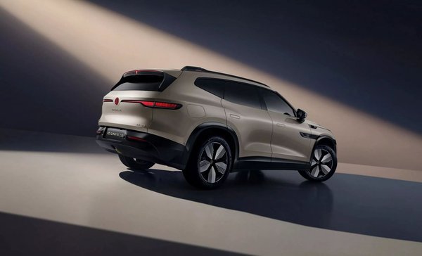 Az elektromos SUV-n sokkal több az ívelt felület, mint amit az európai modellektől megszoktunk, az első lámpák egészen az emblémáig nyúlnak, a lökhárítón alig jutott hely légbeömlőnek. Hátulról ugyanakkor már könnyű belelátni a Skoda Kodiaq-ot. Érdekes külső részlet, hogy a hátsó féklámpa középső eleme egy világító farkast formáz.