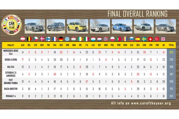 A Car of the Year, azaz Év autója díj történetében nem sokszor fordult elő, hogy egy prémiumautó nyerjen, azonban most pontosan ez történt. A döntőbe jutott hét modell, a Citroen C5 Aircross, a Dacia Bigster, a Fiat Grande Panda, a Kia EV4, a Mercedes-Benz CLA, a Renault 4 és a Skoda Elroq közül végül a Mercedes típusa kapta a legtöbb szavazatot. A 23 európai országot képviselő, 59 tagból álló zsűri 320 pontot adott a CLA-nak, ezzel 1974 után ismét a stuttgarti márkáé a díj.