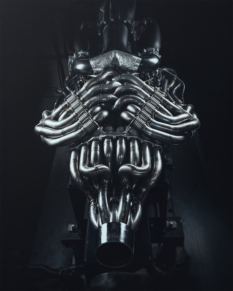 Az új motor azonban nemcsak azért érdekes, mert ehhez hasonló erőforrásból már nagyon kevés felel meg a környezetvédelmi előírásoknak, hanem azért is, mert látványra egy csodásan komponált mestermű. A tizenkét henger leömlői egészen elképesztő alakban futnak össze.